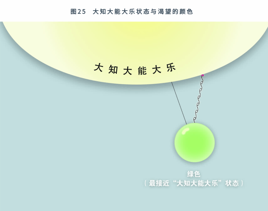 如图25所示,对任何事物的强烈渴望(渴望也是欲望的一种形式)都制造绿色——从灵性观点看,这被适当地视为一切颜色中最好的颜色,因为绿色最接近大知大乐大能(Sat-Chit-Ānand)状态。