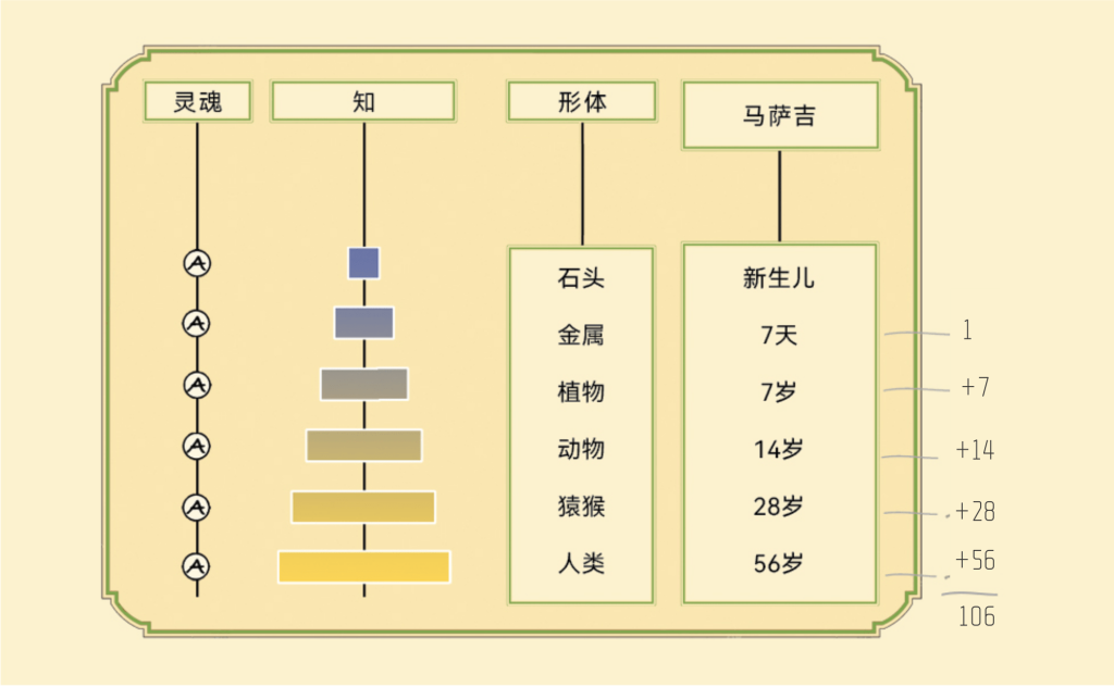 马萨吉出生后7天,可以说达到金属阶段;长到7岁,发展到植物形体,“知”随着形体成长而成长。马萨吉却是同一个,没有变成萨马;也就是说,马萨吉(灵魂)毫无改变。到了14岁,可以说处于动物(阶段)形体。动物比植物有更多的“知”,14岁的人也比7岁的人有更多的“知”。