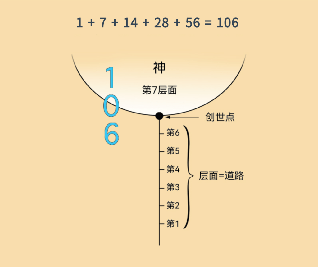 如上图所示,6(阶段)在下面。中间的0(点)是创世点,1(也就是第7层面)在上面。如果你们把所有这些进化阶段(中心数字7及其倍数)加起来,总共是106——对应旁边的106。