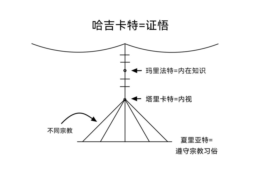 巴巴随后画图说明通过诸层面的灵性道路,并描述了苏非教中引向与神合一的不同阶段:哈吉卡特——证悟;玛里法特——内在知识;塔里卡特——内视;夏里亚特——外部遵守宗教习俗。他还用了如下类比:
